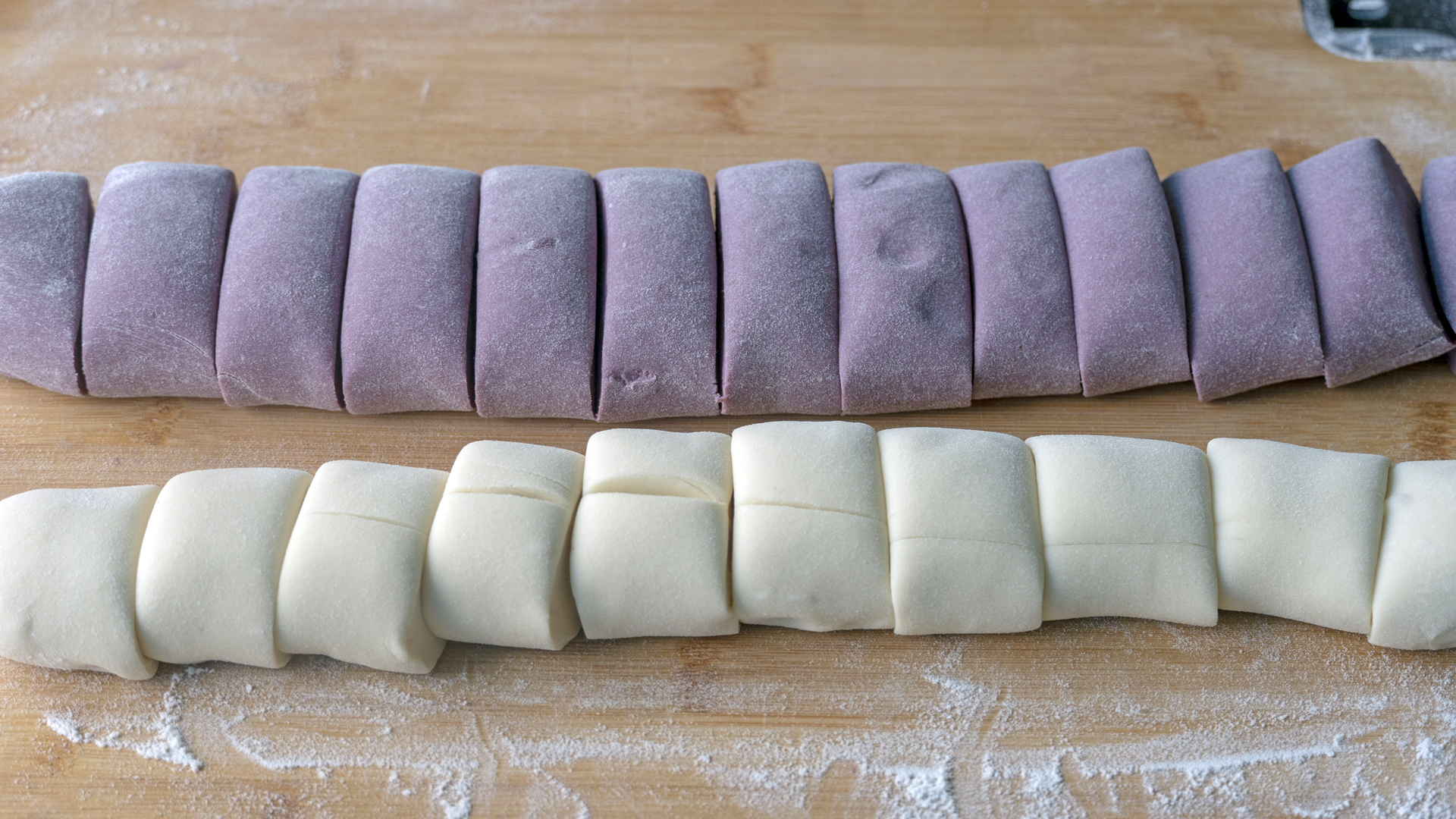 紫色麵團:紫薯220克、20克白糖、2克酵母、250克麵粉、120毫升常溫水