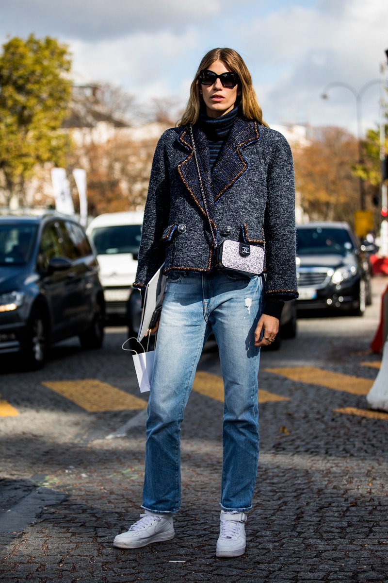 一些修身的高腰線短款小香風外套,不太適合敞開穿,但如果扣上釦子又很容易顯得老氣,解決的辦法就是搭配高腰直筒牛仔褲,既化解了外套的成熟與老氣,多了隨意與不羈,但又不會破壞外套的優雅與端莊,整體著裝效果呈現出來的仍然是非常優雅的,而且牛仔褲還帶來了年輕帥氣的感覺。