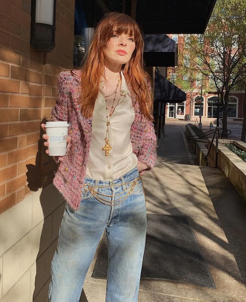 那麼,小香風“粗花呢”外套搭配牛仔褲的時候,要如何增加女人味呢?答案是在內搭上花心思。比如內搭的襯衫,選擇一些宮廷風的荷葉領、花瓣領,或者雪紡材質的飄帶襯衫作為內搭,多了溫柔女人味,優雅減齡不老氣,更顯矜貴,也是絕美的混搭。