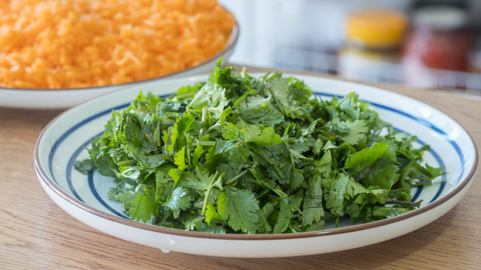 2、再來點香菜,香菜用來炸丸子真的是超級好吃,同樣的用刀切碎一些,尤其是香菜梗子要切得更細小一些,切好後也先放一旁備用;