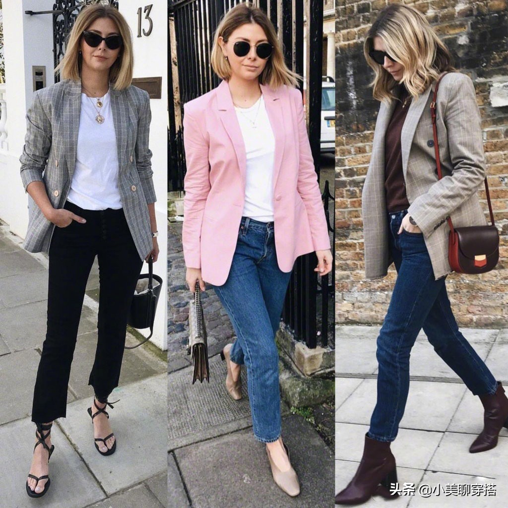 如果我們覺得黑色西裝有些高冷,想穿出職場優雅女人味,我們也可以選擇顏色柔和的西裝,比如櫻花粉小西裝,顏色特別有少女感,很減齡,搭配白T與牛仔褲,增加了一些帥氣的味道,很特別。灰色格紋西裝比較有學院風,搭配白T與小黑褲,有一種很清新的自在感,同時也顯得氣質非凡。