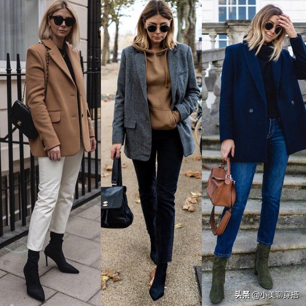 你有沒木有發現,時尚博主的每一套小西裝的款式都是比較廓形一些的,沒有很收腰的設計,直線條,這樣更顯得大氣一些。有些寶寶覺得廓形的西裝沒有腰身會顯胖,那麼我們可以選擇稍稍修身一些的內搭,這樣就比較顯瘦了。