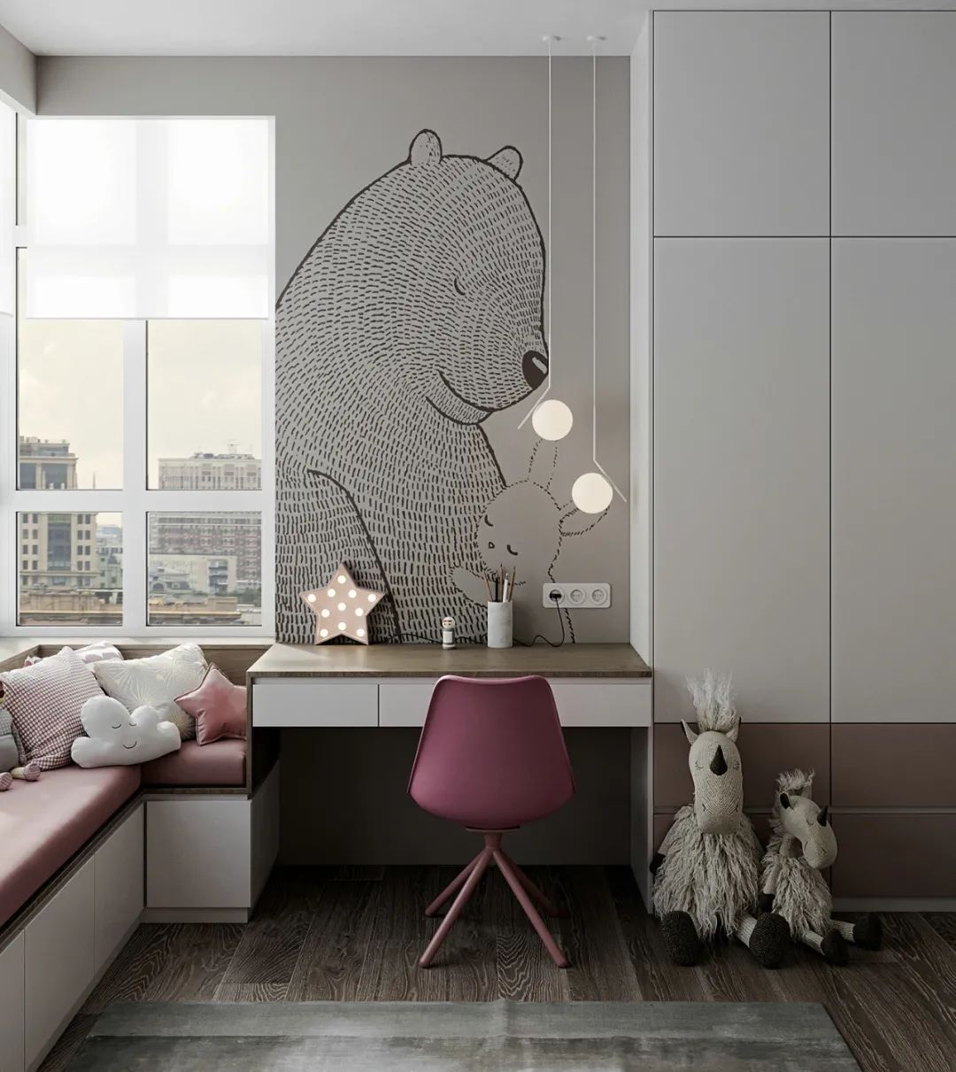把飄窗設計一張書桌/梳妝台,根據自己的生活習慣設計左邊辦公,右邊梳妝,抽屜也能收納生活雜物。