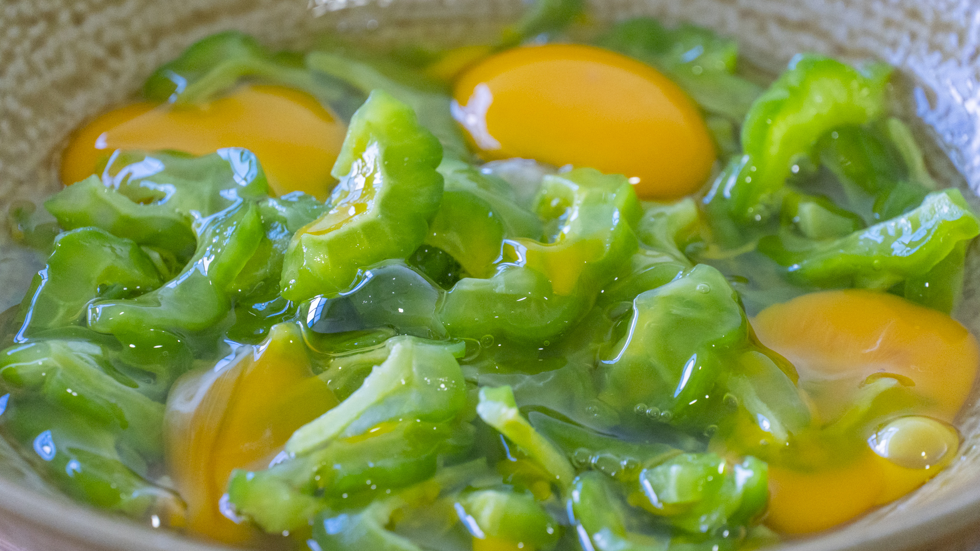 食材清單:苦瓜1條、雞蛋5個、澱粉水、油、鹽