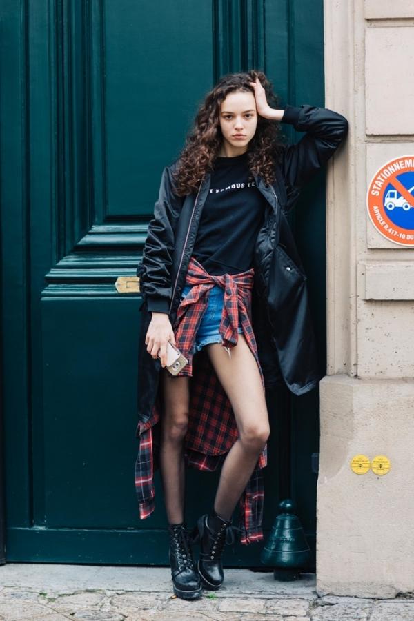 格紋襯衫搭配撕邊牛仔褲街頭又隨性。