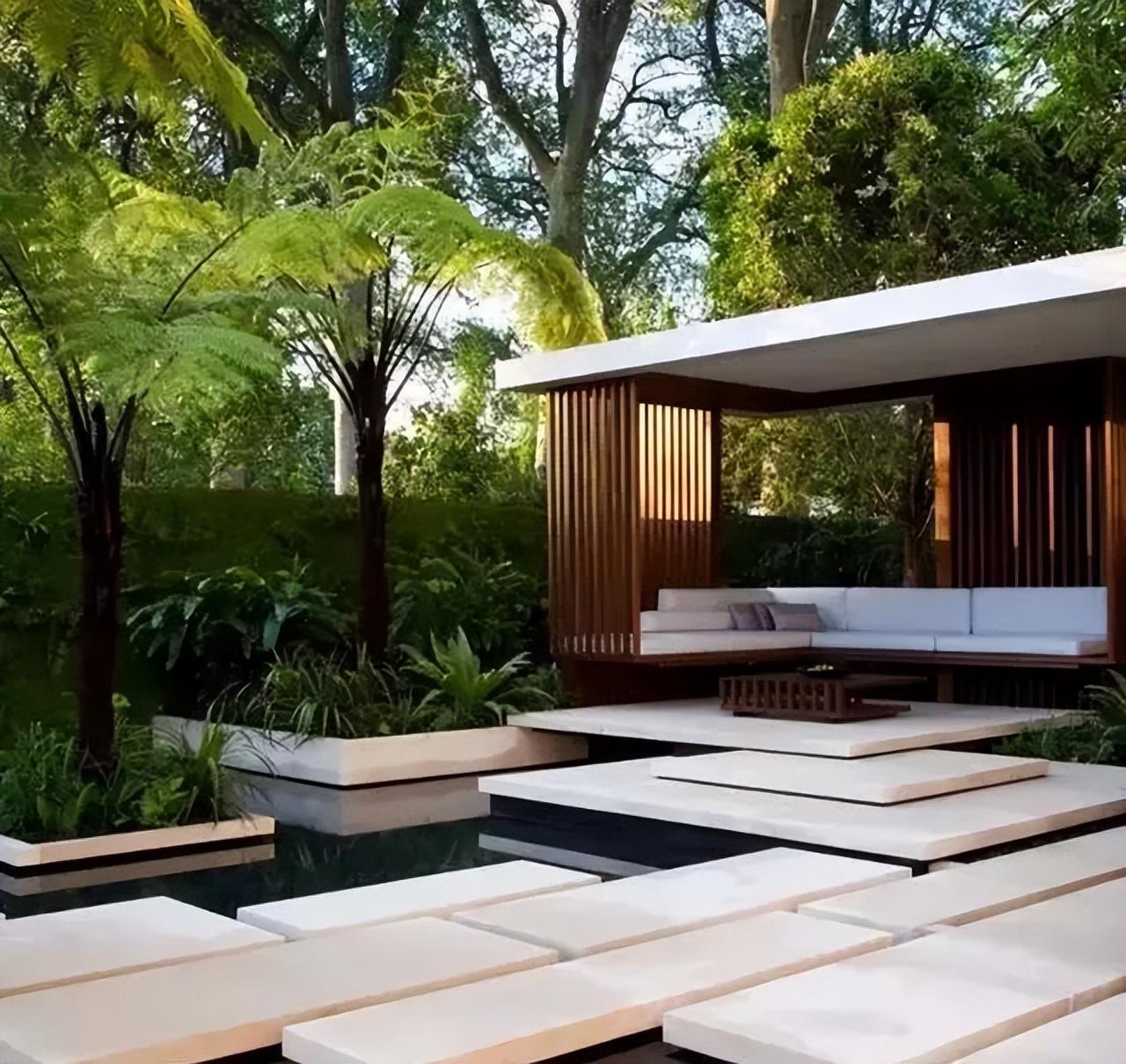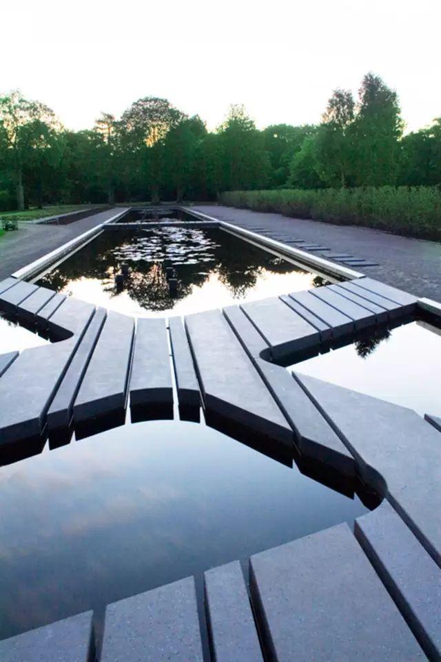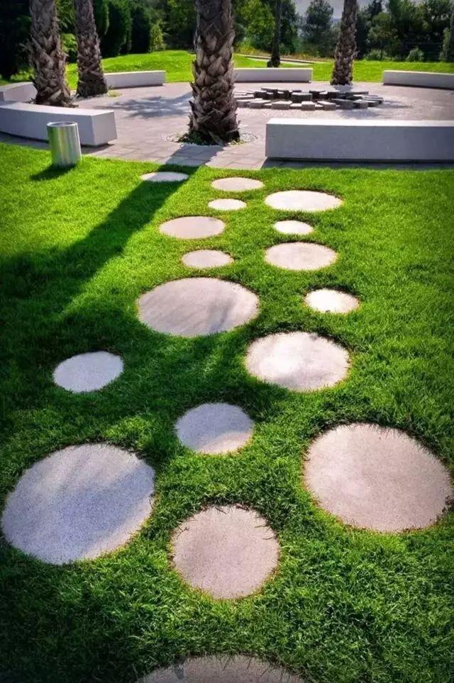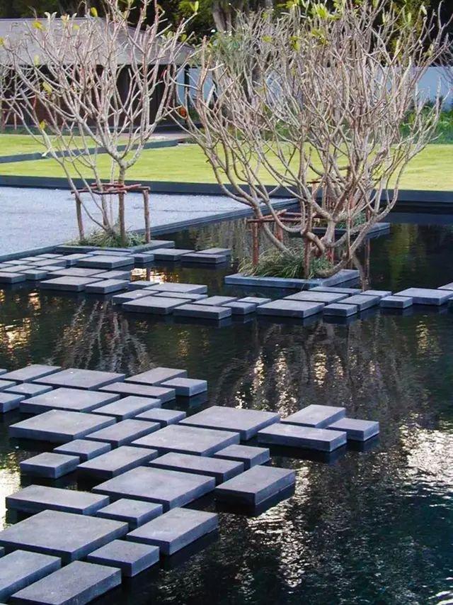 現代汀步的形式不止局限於傳統的自然形態,有了更多形式和材質的選擇,方形、圓形、橢圓形,石材、木材、金屬……