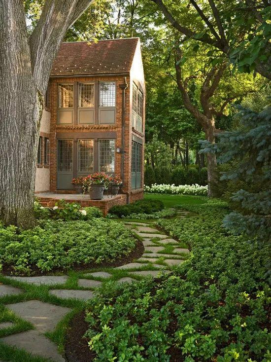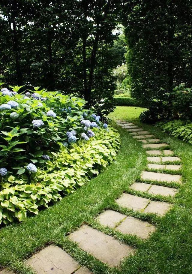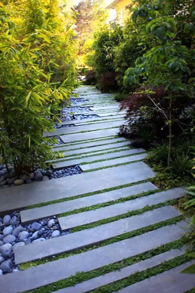 在狹長的空間中佈置汀步,與草地很自然的融為一體,使整個空間不至於那麼擁擠,而不規則擺放的汀步,又讓這條小道富於變化,並且在親綠空間的同時也能保證草坪植被不被破壞,帶給人不一樣的自然體驗。