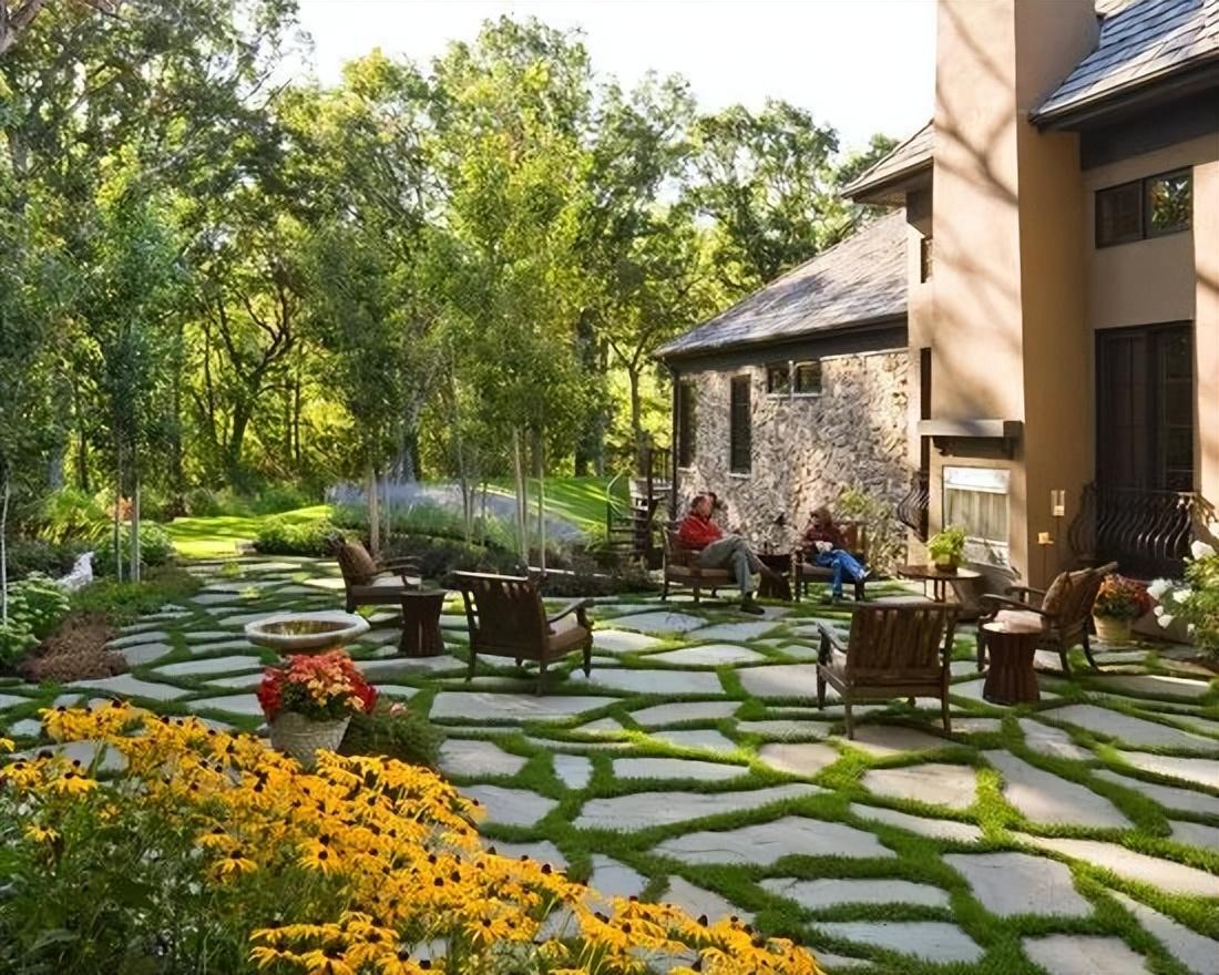 旱汀步多建於草坪之上,屬於親綠空間的一種表達形式。中國古典園林中常以零散的疊石點綴於窄而淺的水面上,使人易於躡步而行,其名稱叫“汀步”,或叫“掇步”、“踏步”,《揚州畫舫錄》亦有“約略”一說,日本又稱為“澤飛”。