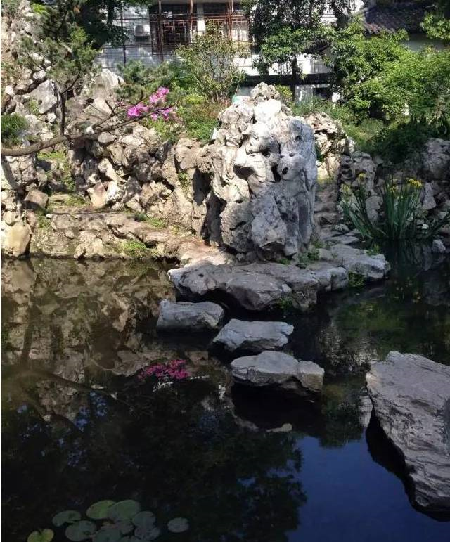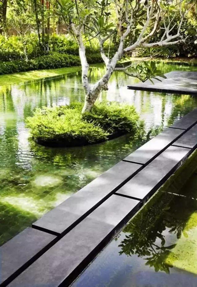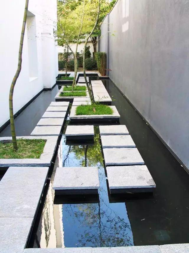 在平靜的水面上,汀步或整齊、或規律、或隨意的排佈著,腳下是潺潺的水流,入眼是庭院之趣,彷彿置身於山間叢林,頗有歲月靜好之感。