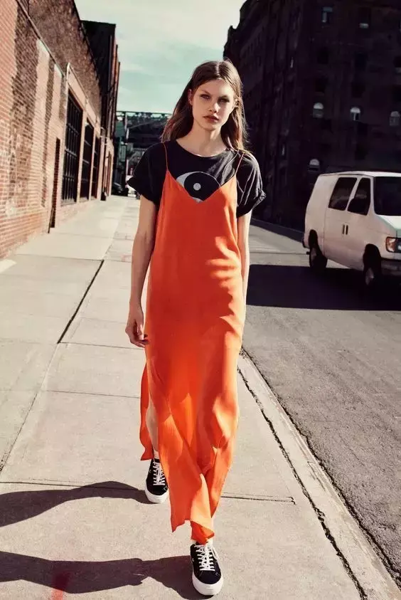 對肩部曲線不自信的女孩可以巧妙的在吊帶裙裡面配一件簡單的T卹,性感不減,還多了幾份休閒味道。