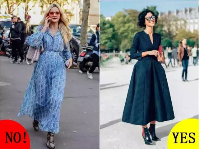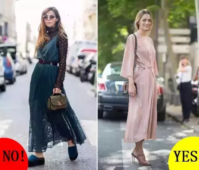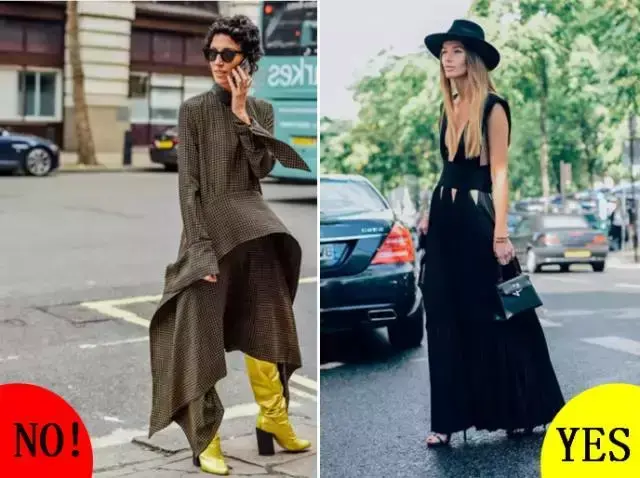 長款的連衣裙和鞋子之間一定要穿出“透氣”的感覺,不要從上到下全部包裹住。左邊這身Look裡誇張的金色鬆垮長靴除了累贅,腿也看起來短了很多。