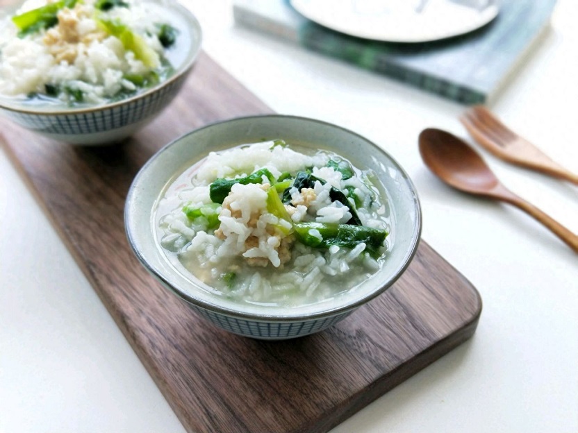 【食材清單】:剩米飯,肉末,萵筍葉,清水,芝麻油,鹽。