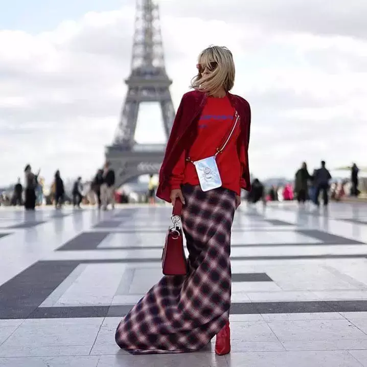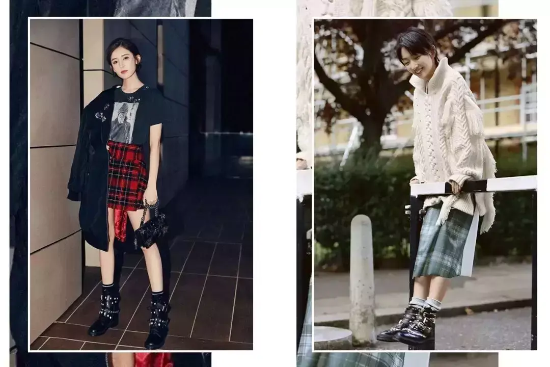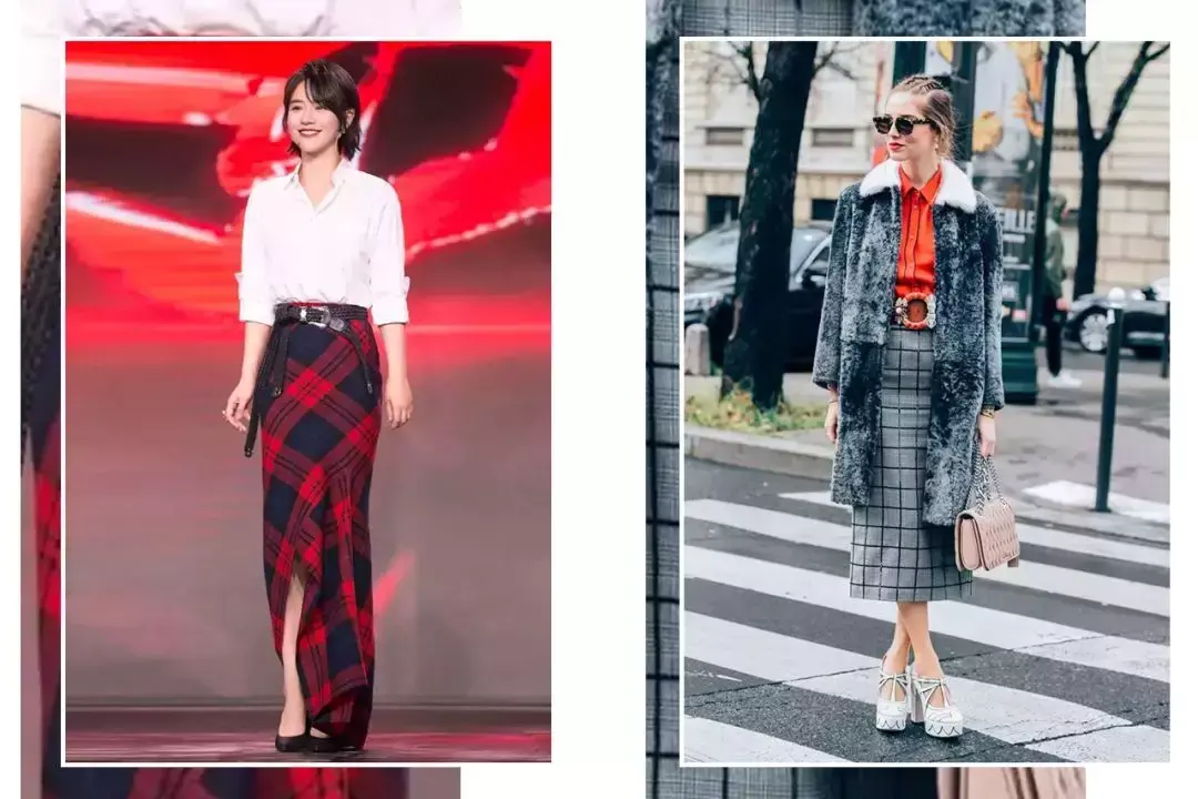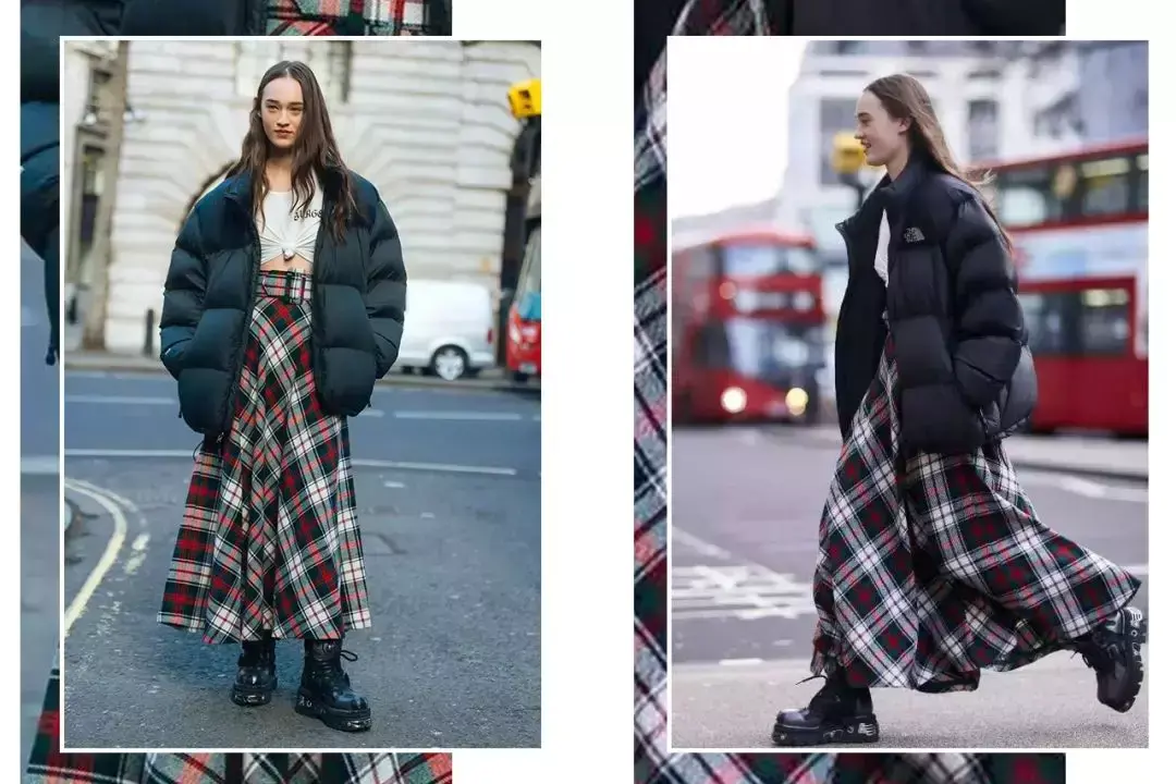 個性的不對稱設計與正經的格紋結合,復古與叛逆的碰撞別有一番韻味。  冬天很多人會穿色彩比較單一的羽絨服,不妨來一條長格紋裙來打破沉悶。