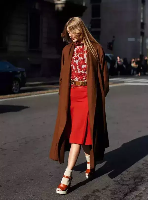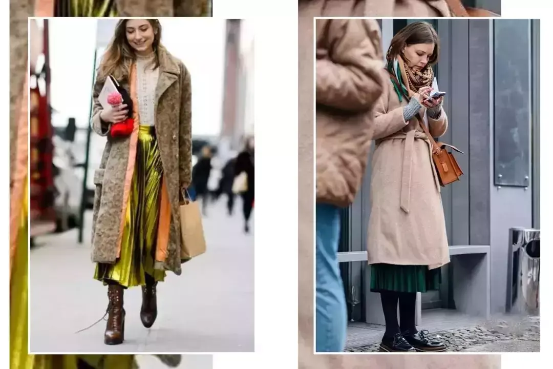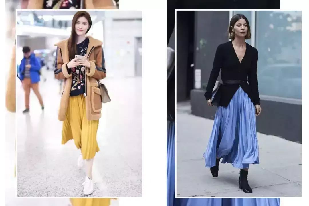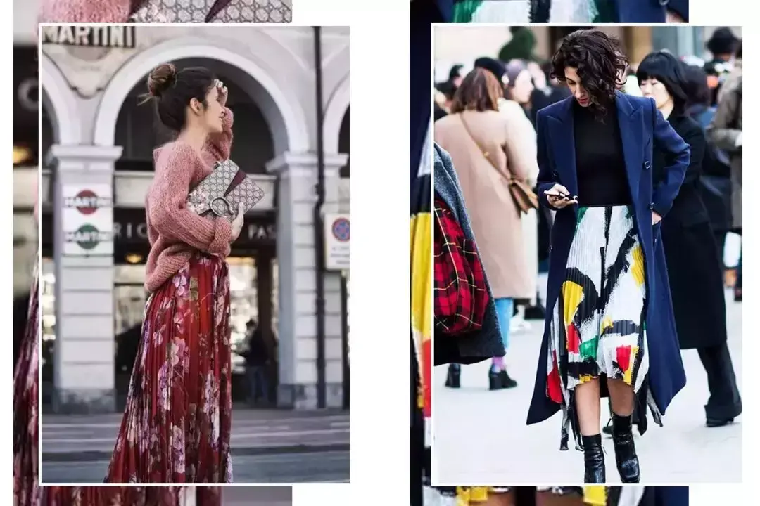 冬天穿的顏色通常是黑白灰,這時候不妨穿上一條亮色的印花百褶裙,整體穿搭都會更有生機。