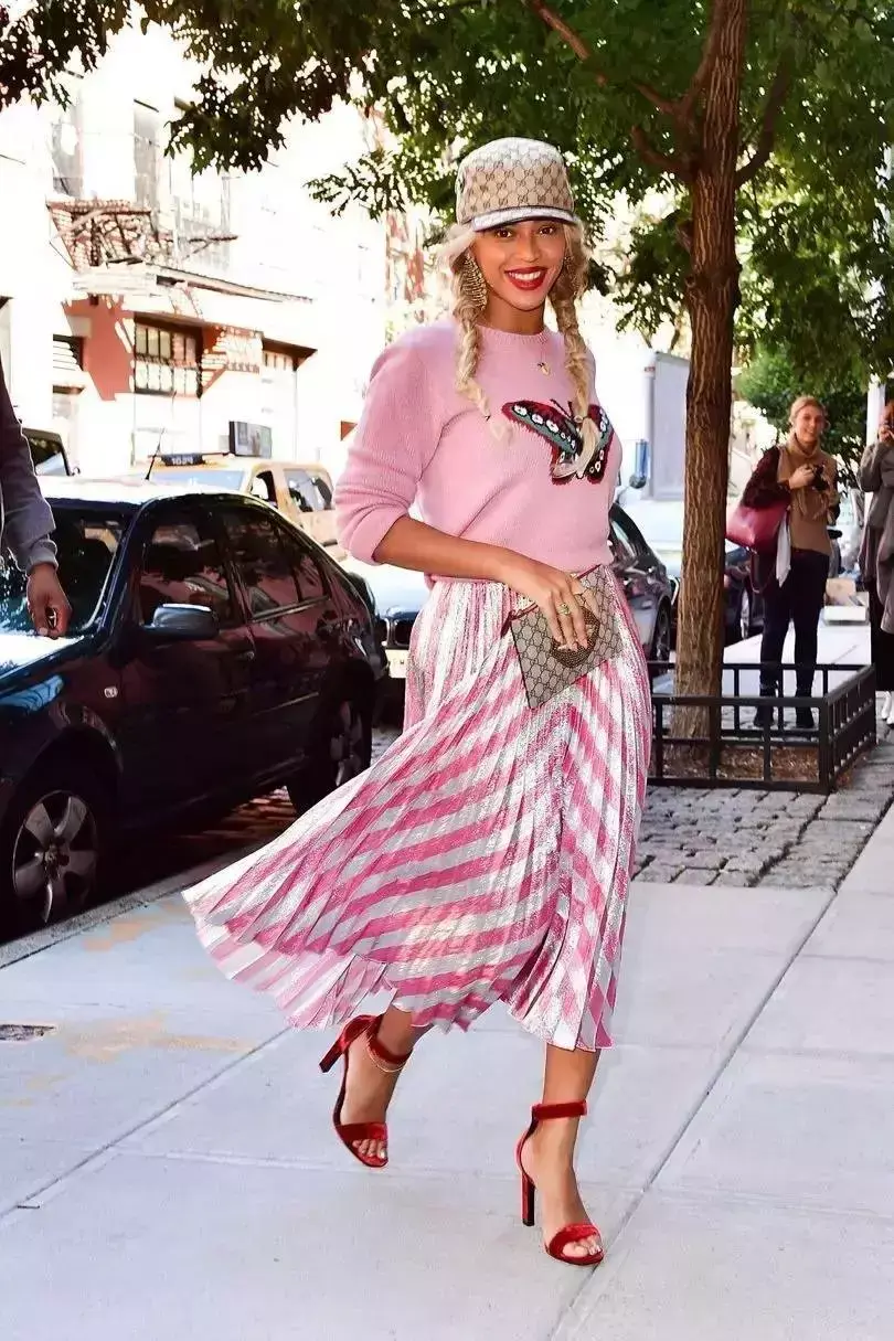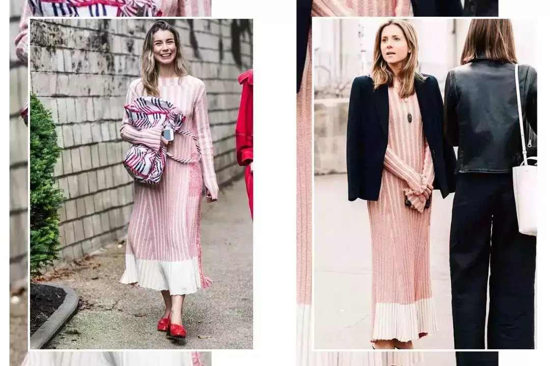 這件粉紅色拼接的條紋針織裙也有不少型人在穿,你要不要也考慮入手一條同款呢?