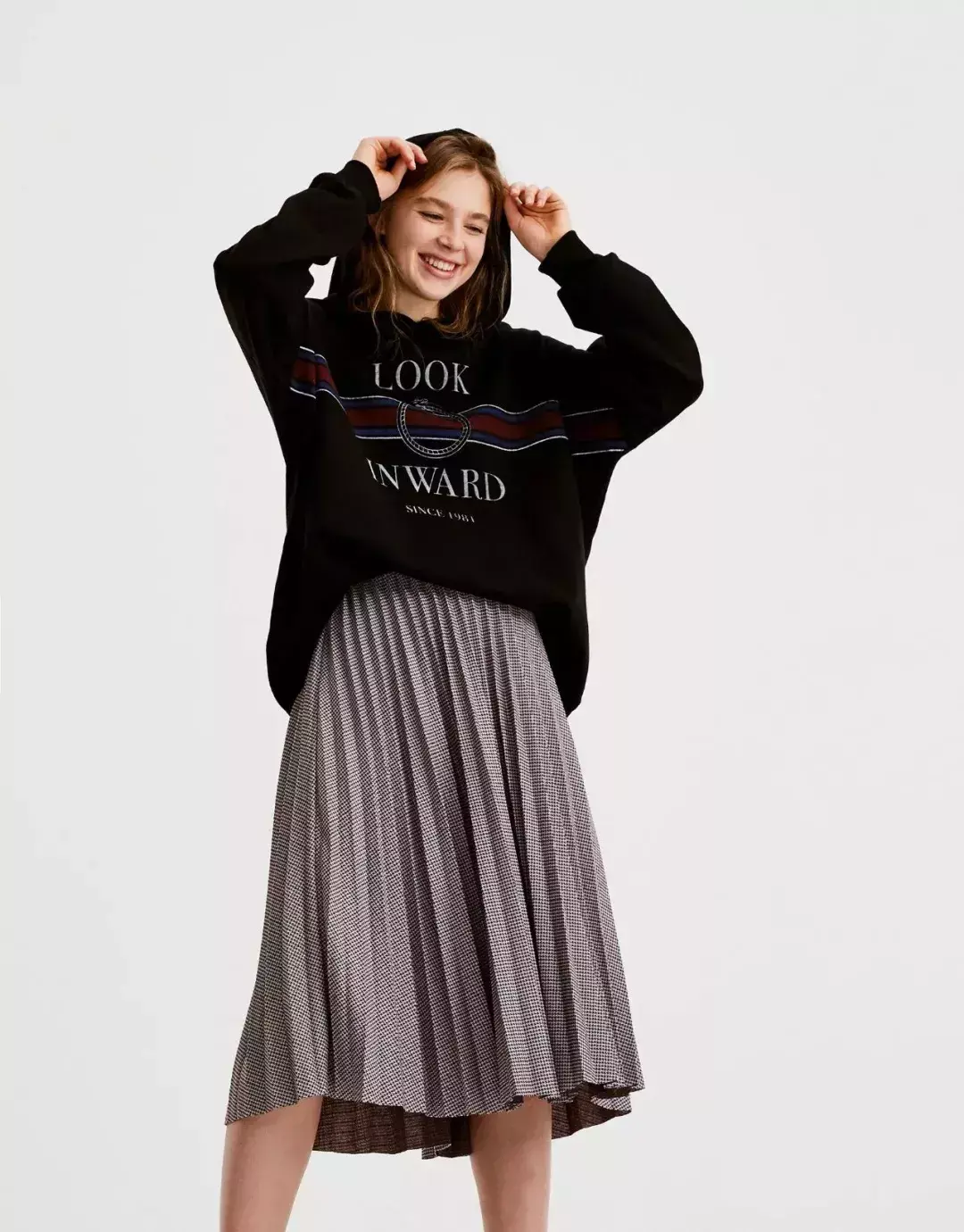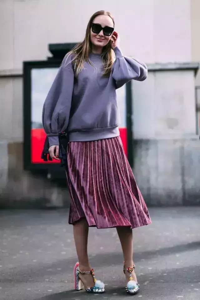 休閒衛衣搭配百褶裙,混搭得很奇妙,街頭運動感也能穿出迷人氣息。