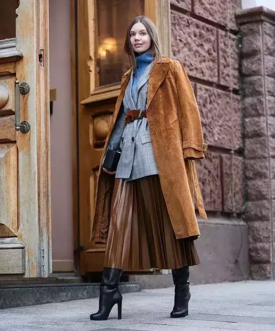 皮質的百褶裙更顯都會女性的硬朗幹練,用皮質長靴來搭配整體和諧順暢。