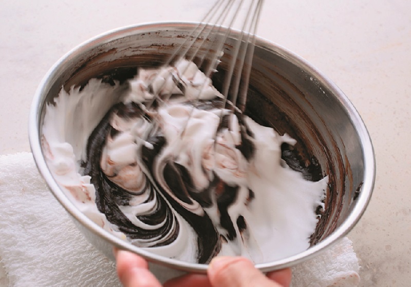 做法上,只需依照順序將蛋黃、蛋白霜、麵粉和可可粉加入融化的巧克力和奶油中,攪拌均勻即可。此食譜特別列出了製作蛋白霜的重點,即使是甜點新手也不容易失敗。