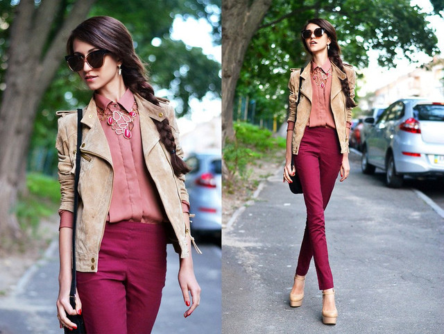 這件帶點紫紅色的褲子,卻讓整個穿搭更有元氣而且特別