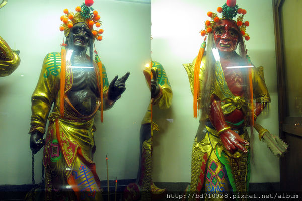 不管任何廟會,七爺八爺的身影往往是最受矚目的,七爺白袍高帽,臉畫「白底黑蝙蝠」,手持魚枷;八爺黑衣圓帽,臉畫「黝黑白睛」,手握方牌,上書「善惡分明」。而七爺的沈穩和八爺的活潑,也往往令人映像深刻。