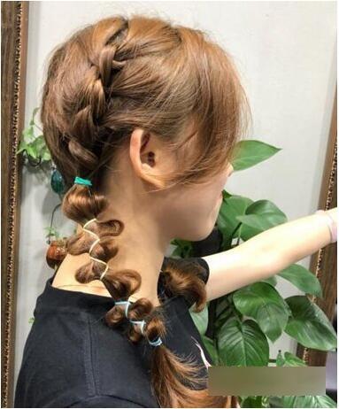 斜劉海髮型梳在了臉頰邊緣,用了細細的絲帶綁起來的女生燈籠辮髮型,斜劉海順著髮際線梳到後 側,雙閘閥髮型編起來比較蓬鬆,中長發髮型一直編到了後脖頸髮際線,剩餘的發尾才做了交疊辮 子。