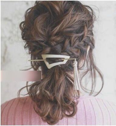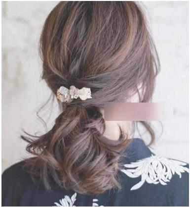 髮際線上的頭髮做成兩邊交疊的曲線,女生中長發編發公主頭髮型,將發尾的頭髮做成內扣的卷 發,女生中長發編發髮型用了一個髮飾點綴在後脖頸位置,女生中長髮公主頭髮型立體而蓬鬆。