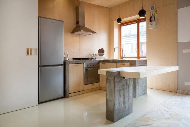 四周是防水泥的地磚,中間是木地板,這種獨特的設計很少見,但是給人一種特別的搭配感。
