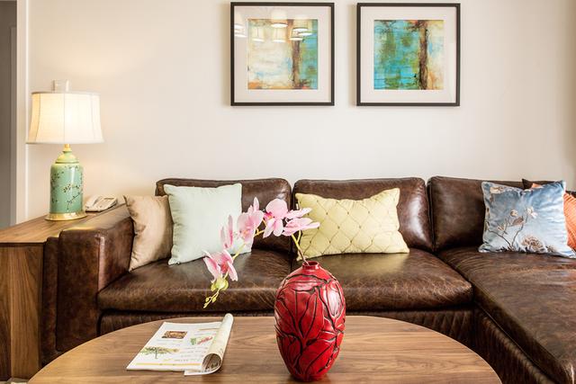 整個客廳地面選用了深色的仿古磚斜鋪,給人一種立體的幾何感。深色的沙發,非常具有自然紋理特色的木質茶几以及很有中式韻味的檯燈。中式的黑紅花紋瓶給人一種獨特的歷史感和田園感。