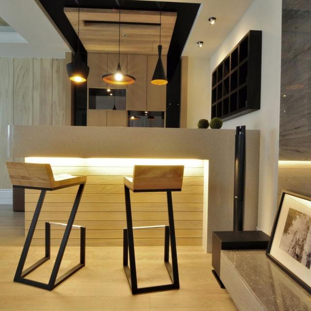 吧檯設計的非常巧妙有趣,造型獨特的高腳凳給人一種非常個性時尚的感覺。木板造型的設計,牆面上還設計了黑色的格子置物架。下班後可以在這裡,和家裡坐在這裡喝一杯冰啤酒,聊聊天。