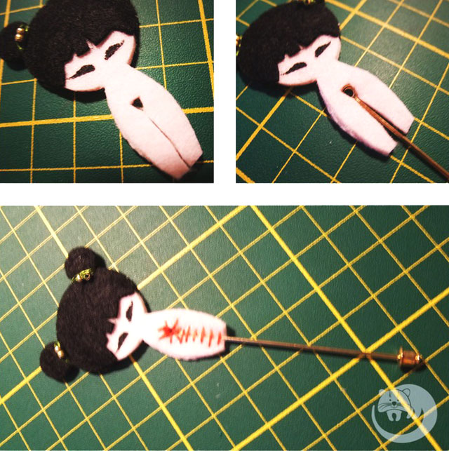 步驟11:最後在身體布片上粘貼上和服的前後片,再在前片上粘貼上橙色圓傘,這樣就完成了日本和服娃娃帽針的製作