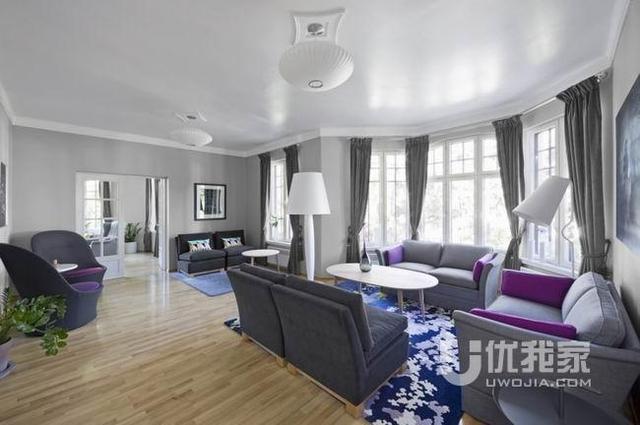 灰色與紫色混拼的沙發,灰色的窗簾,白色的落地燈和吊燈,