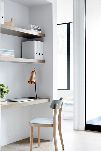 把柜子轉角區域做成書桌。轉角處儲物不便,不如做成開放式的書桌。