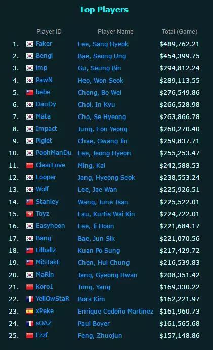 而且要知道,英雄聯盟目前全球各地官方註冊的職業選手加起來也才不到7000人,所以可想而知,其中的佼佼者能獲得多高的收益了。我們以往經常說,某某某直播XXX月入百萬,先不管真假,但那至少是說主播的,就目前助手哥搜集到的數據來看,大部分職業選手的工資是遠遠不如一些主播的,但這並不表示,他們就是我們眼裡的「窮人」。