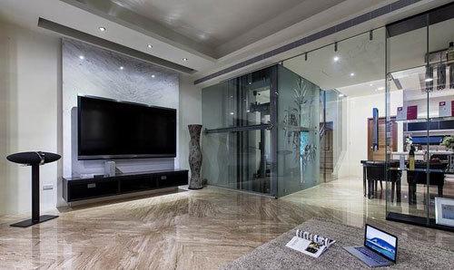 背景用大理石作為底色,組合櫃用黑色相對,玻璃門的映照質感尤為凸顯。