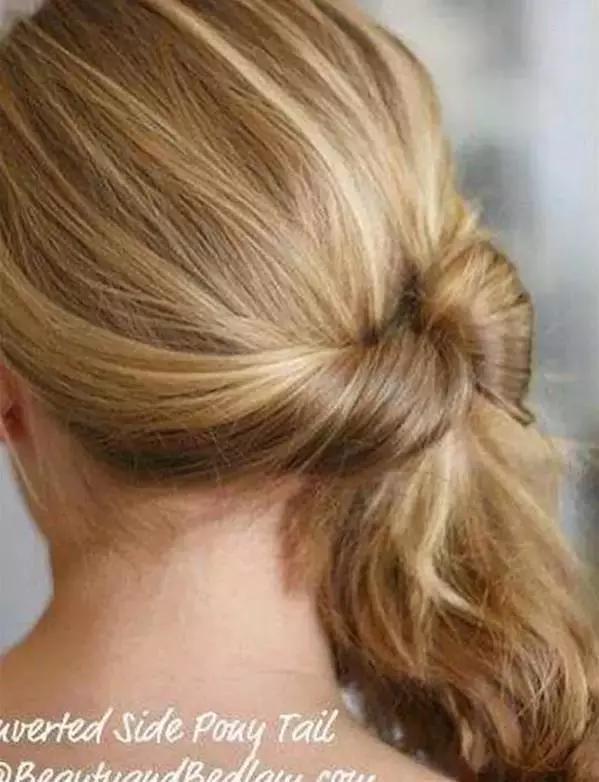 把馬尾兩邊的頭髮卷一卷,然後再變成倒馬尾就可以變成一個簡單的髮髻。