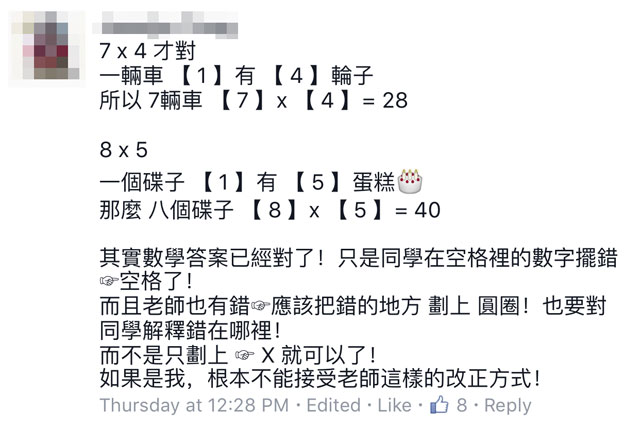 其實數學答案已經對了!只是同學在空格里的數字擺錯空格了! 是的,根據正式的解答,數學題的格式必須根據題目來解答,並不能隨意擺放數字位置。而有網友表示該老師應該把錯的原因告訴學生,以讓他們能知道下次不會再犯。 但是!這種教學方式別人不知道,小編是大大力反對的! ▼先看看以下網友「冷滿紅」的論點