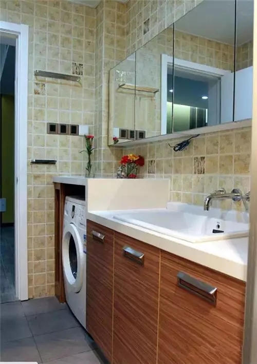 洗手間是最常見的洗衣機收納空間了,擺在洗漱台的邊上,還可以方便將水注入洗衣機中。
