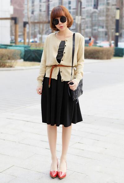 黑白條紋T卹搭配黑色雪紡裙,外套一件米黃色的針織開衫系