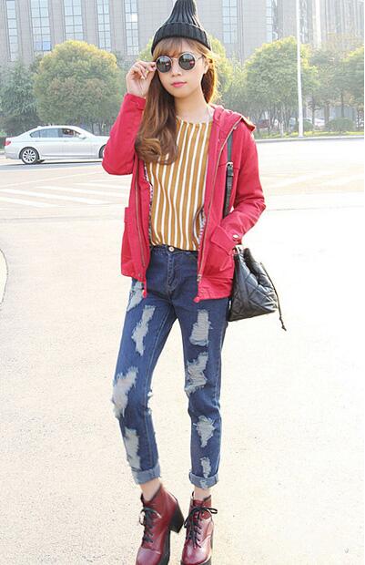 個性十足的破洞牛仔褲搭配一雙酒紅色的馬丁靴,
