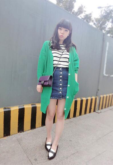 黑白條紋T卹外搭一件中長款的綠色針織衫,