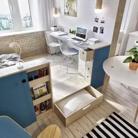 有網友把這招升級成"夫妻桌",雙人書桌中間加個鬥櫃隔間,五平米空間同時兼容辦公和收納,比硬隔出書房聰明多了。