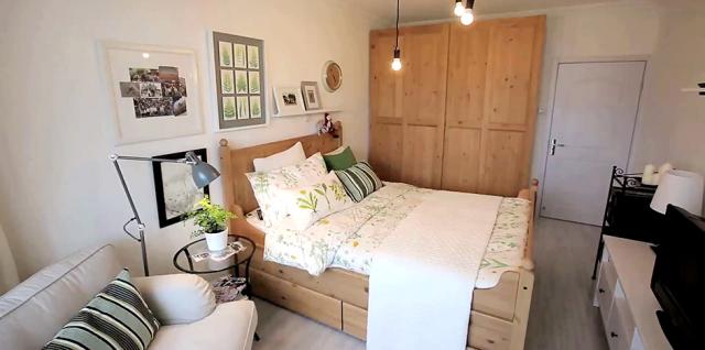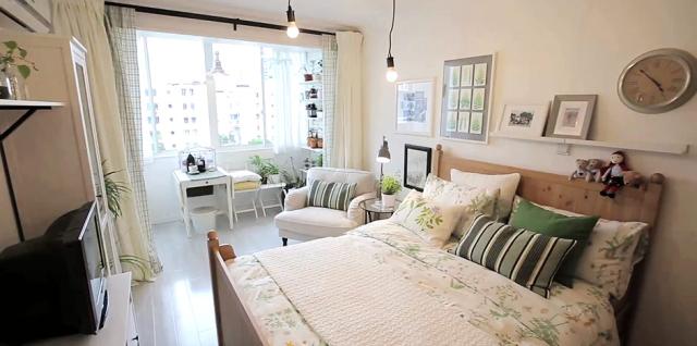 ↑改造之後的臥室是不是很贊?布藝窗簾替代推拉門,引進更多光線,既提升了居室的光亮度,又添一抹清亮。綠色系的床用紡織品和同色系的靠墊,打造出春意盎然的居家氛圍。