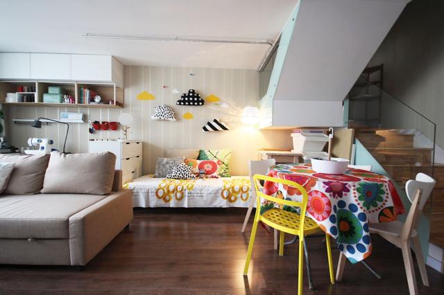 沙發前移之後,騰出了理想的辦公縫紉區,牆面安設一些壁櫃和隔板,存放辦公用品和縫紉用具。工作檯面寬敞又整潔,這位宜家員工的辦公和媽媽的縫紉可以自在進行了~更讓人驚喜的是,原來放置書桌和縫紉機的區域還增創了一個休息區,樓梯下的空間也得到了更好的利用,全家人因此有了聚餐的地方(見下圖),客廳一下子變得豐富起來,面面俱到太讓人喜歡了!