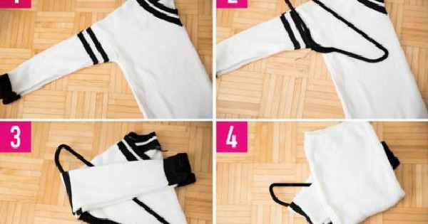 你掛毛衣的方式和掛襯衫是一樣的麼?那就大錯特錯了。毛衣這種自重比較大的衣物需要如下圖所示這麼掛才可以避免變形的厄運哦!