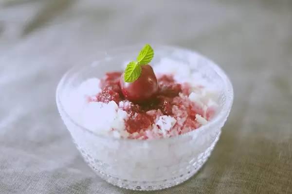 4、做一碗牛奶刨冰(牛奶在冰格里凍好後,攪拌機打碎),將楊梅醬澆上就可以吃了。