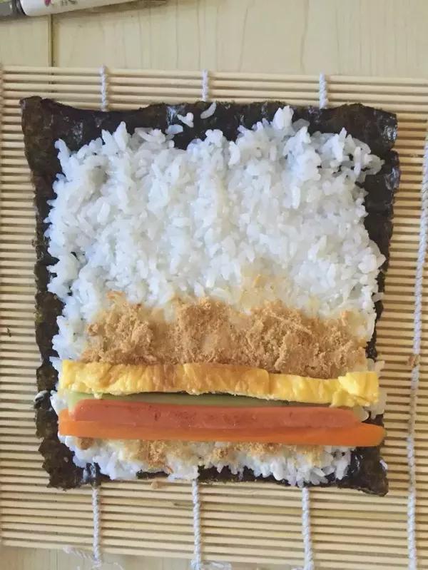 7 鋪上適量的米飯,注意有三個邊留半公分的空位不要鋪,然後用手或者用飯勺壓實。