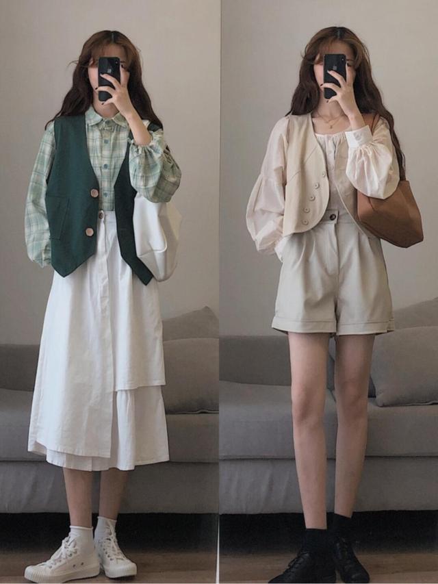 綠色是今年流行色之一,在萬物復甦的春天,小姐姐們也可以考慮入手一件綠色的時尚單品噢。墨綠色馬甲和淺綠色襯衫搭配,順色系搭配配色清新,精緻的剪裁和合體的廓形,讓柔美的綠色馬甲也變得帥氣起來,再搭配一條白色不規則半身裙,簡直不要太文藝噢!