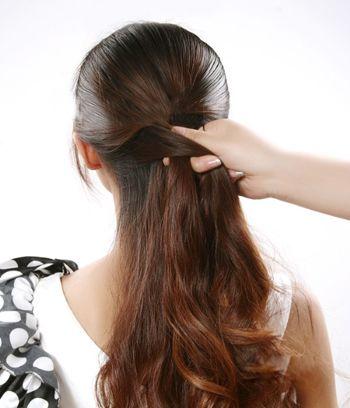 第一步:首先直捲髮的女生將長發全部披散在身後,用梳子梳理通順,將雙耳雙方的全部髮絲聚集在一起,用手握住。