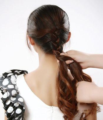 第三步:將長發全部編進蜈蚣辮中後,剩餘的長髮尾改編三股辮。