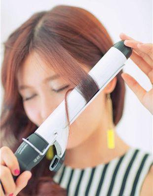 第一步:首先將中長捲髮中分梳理,長長的直發劉海用電卷棒燙成捲髮劉海。